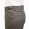 100% wool. Not to loud but not too dark either. All the usual trousers are flat front and tapered in our slim cut. Side adjusters too.